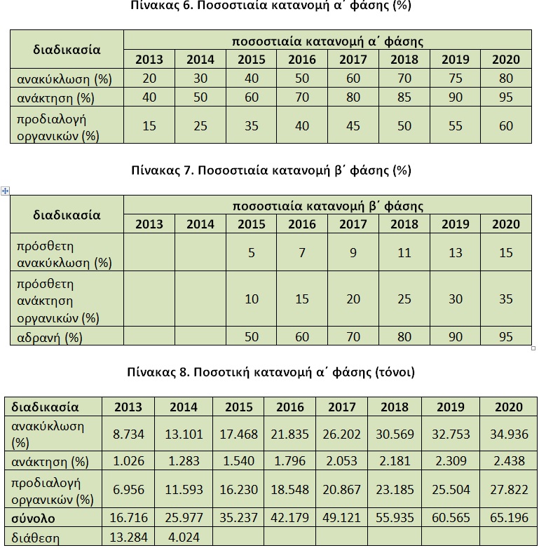 • στην πρώτη φάση, η ανακύκλωση να ξεκινήσει το 2013 από το 20 % και να φτάσει το 2020 στο 80 % και η προδιαλογή οργανικών να ξεκινήσει το 2013 από το 15 % και να φτάσει το 2020 στο 60 %. Τα αντίστοιχα ποσοστά της ανάκτησης άλλων υλικών είναι 40 % και 95 %.