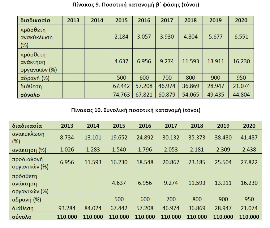 • Στη δεύτερη φάση η πρόσθετη ανάκτηση ανακυκλώσιμων να ξεκινήσει από ένα 5 % το 2015 και να φτάσει το 2020 στο 15 % (συνολικά, 95 % ανάκτηση ανακυκλώσιμων) και η πρόσθετη ανάκτηση οργανικών να ξεκινήσει το 2015 από ένα 10 % και να φτάσει το 2020 στο 35 % (συνολικά, 95 % των βιοαποδομήσιμων). Ο δε διαχωρισμός αδρανών να ξεκινήσει από το 50 % και φτάσει το 2020 στο 95 %.