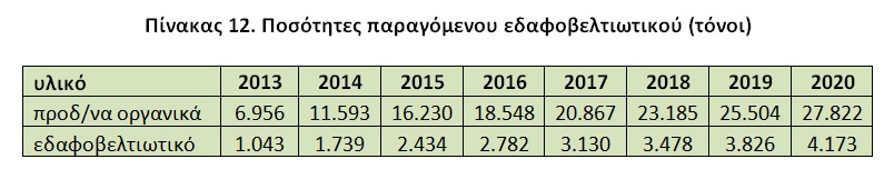 Με βάση τα στοιχεία του πίνακα 12 και με μια μέση τιμή διάθεσης 150 €/τόνο, τα αναμενόμενα έσοδα από τη διάθεση του εδαφοβελτιωτικού θα είναι: