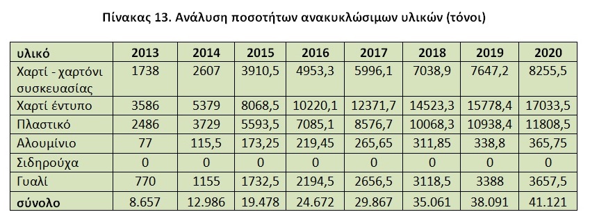 Πίνακας 13. Ανάλυση ποσοτήτων ανακυκλώσιμων υλικών (τόνοι)