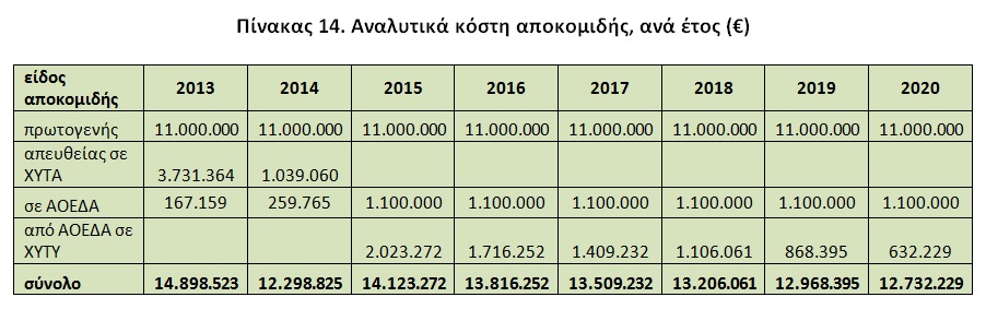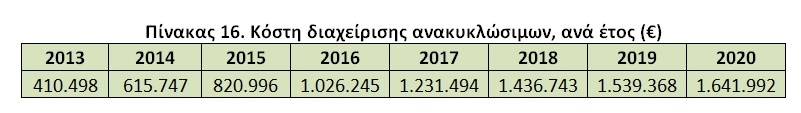 Αυτό σημαίνει ένα κόστος διαχείρισης ανακυκλώσιμων, της τάξης των 47 €/τόνο. Με βάση αυτό το στοιχείο και τα συγκεντρωτικά στοιχεία του πίνακα 13, θα έχουμε τα παρακάτω κόστη διαχείρισης ανακυκλώσιμων, ανά έτος: