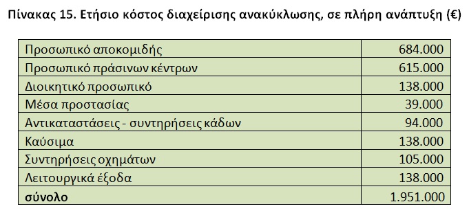 Πίνακας 15. Ετήσιο κόστος διαχείρισης ανακύκλωσης, σε πλήρη ανάπτυξη (€)