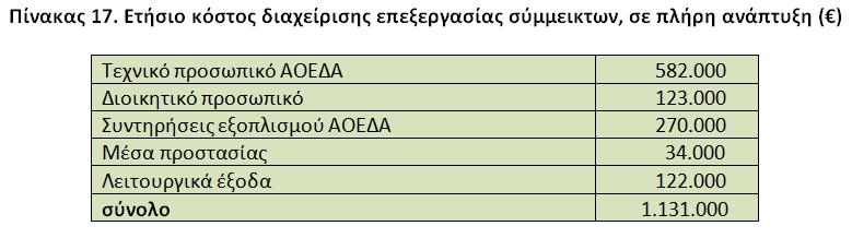 Πίνακας 17. Ετήσιο κόστος διαχείρισης επεξεργασίας σύμμεικτων, σε πλήρη ανάπτυξη (€)