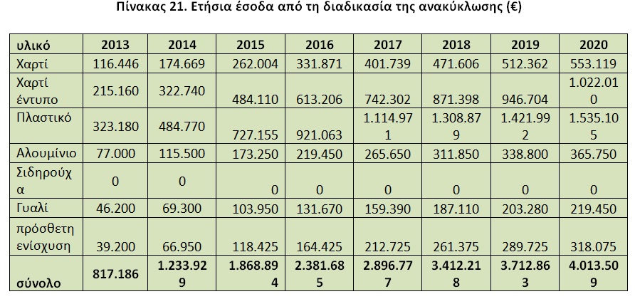Πίνακας 21. Ετήσια έσοδα από τη διαδικασία της ανακύκλωσης (€)