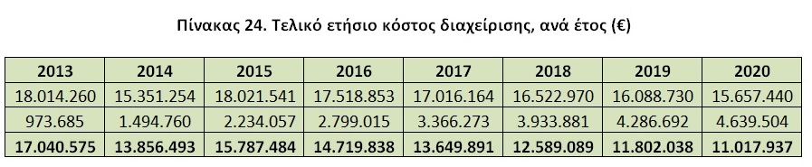 Αθροίζοντας τις παραπάνω τέσσερις κατηγορίες κόστους έχουμε το συνολικό κόστος διαχείρισης, ανά έτος: