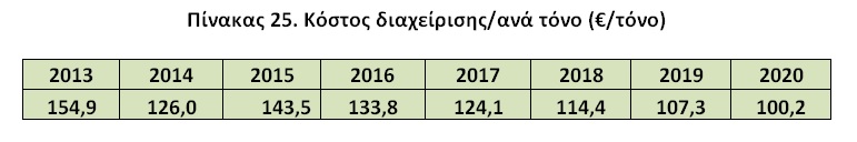 Πίνακας 25. Κόστος διαχείρισης/ανά τόνο (€/τόνο)