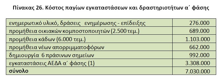 Πίνακας 26. Κόστος παγίων εγκαταστάσεων και δραστηριοτήτων α΄ φάσης