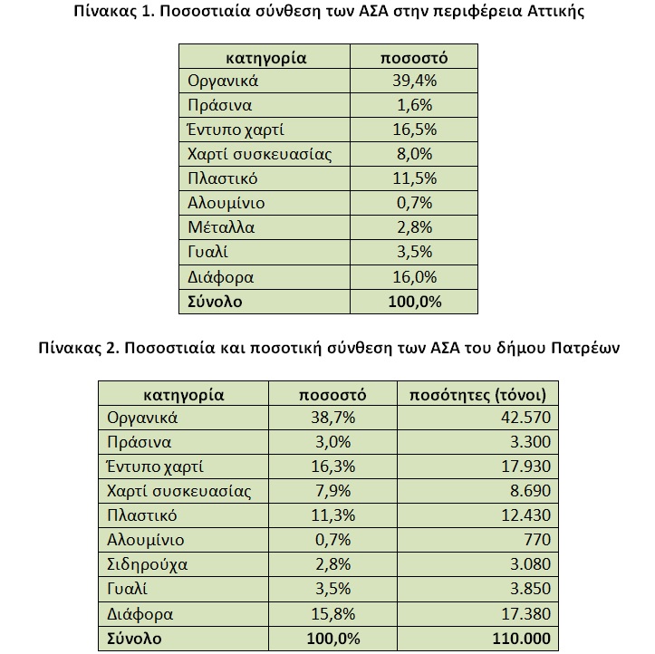 Στην περίπτωση της Πάτρας, εκτιμάται ότι το ποσοστό των πράσινων είναι μεγαλύτερο, της τάξης του 3%, οπότε αναπροσαρμόζονται (μειώνονται) ανάλογα τα ποσοστά των άλλων κατηγοριών. Με βάση αυτήν την παραδοχή, έχουμε την παρακάτω ποσοστιαία και ποσοτική σύνθεση των ΑΣΑ του δήμου Πατρέων (πίνακας 2).