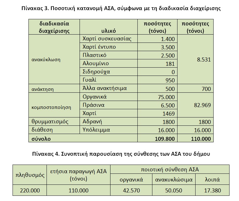 Με βάση τα παραπάνω, τα 500 kg/έτος, ανά κάτοικο μπορούν να θεωρηθούν μια ασφαλής παραδοχή για τα επόμενα χρόνια, για μια πρώτη προσέγγιση του ζητήματος. Συνεπώς, μιλάμε για μια συνολική ετήσια παραγωγή αστικών απορριμμάτων (ΑΣΑ) στο δήμο της τάξης των 110.000 τόνων.