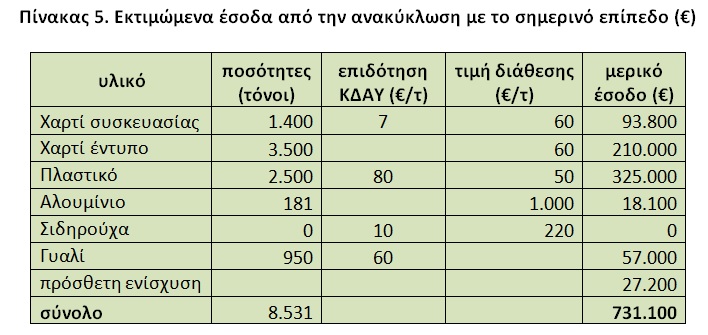 Εκτός των εσόδων από τη διάθεση των ανακυκλώσιμων, η νομοθεσία προβλέπει επιδότηση των ΚΔΑΥ για ορισμένα από τα ανακυκλώσιμα, καθώς και πρόσθετη ενίσχυση των δήμων, ανάλογα με το επίπεδο της ανακύκλωσης που επιτυγχάνουν. Για παράδειγμα: στην ανώτερη κλίμακα απόδοσης (πάνω από 30 kg/κάτοικο/έτος) η επιδότηση είναι 70 €/τόνο. Με δεδομένη την παραδοχή για το σημερινό πολύ χαμηλό επίπεδο ανακύκλωσης του δήμου (21,2 kg/κάτοικο/έτος) και με σημερινές, πραγματικές τιμές διάθεσης των βασικών ανακυκλώσιμων υλικών, θα υπήρχαν τα έσοδα του παρακάτω πίνακα, αν ο δήμος απεγκλωβίζονταν από το σύστημα της ΕΕΑΑ και αν ανέπτυσσε δικό του ανεξάρτητο σύστημα συλλογής – διαλογής και διάθεσης των ανακυκλώσιμων υλικών: