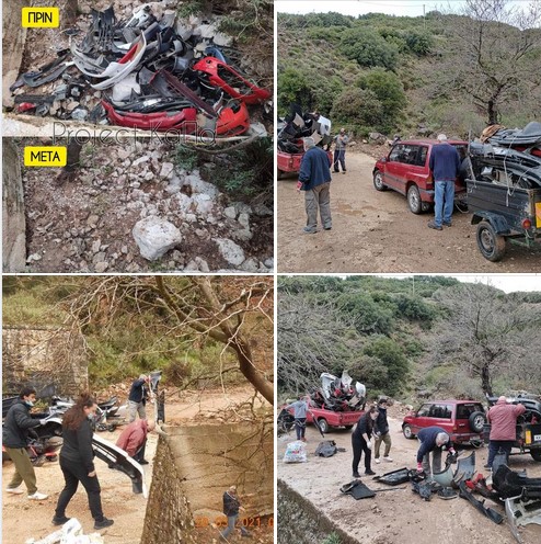 Ένα αγροτικό αυτοκίνητο και ένα τρέιλερ ανέβηκαν το δύσβατο δρόμο όπου και φόρτωσαν τα κομμάτια αυτοκινητων από τη ρεματιά και τα μετάφεραν μέχρι και το σημείο που τα παραλάβαμε με το φορτηγάκι της ομάδας μας και τα αφήσαμε σε ειδικό χώρο που μας υπέδειξε ο Δήμος Πατρέων έπειτα από συνεννόηση! ![]()