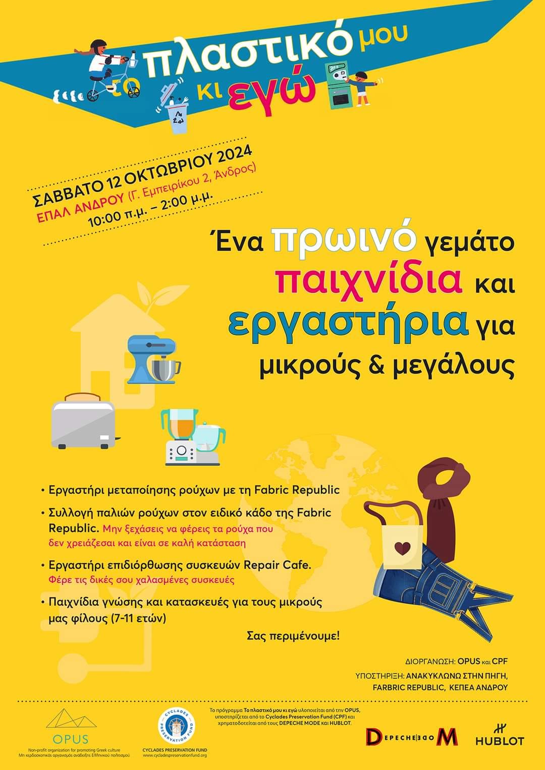 Το Σάββατο 12/10/2024 το Repair Cafe Πάτρας συμμετείχε στο εγκεκριμένο από το υπουργείο παιδείας πρόγραμμα «Το πλαστικό μου και εγώ» που υποστηρίζεται από το Cyclades Preservation Fund (CPF) και σχεδιάζει και λειτουργεί η OPUS Culture. Η εκδήλωση πραγματοποιήθηκε στον προαύλιο χώρο του ΕΠΑΛ Άνδρου (Γ. Εμπειρίκου 2, Άνδρος) σε συνεργασία με το ΚΕΠΕΑ Κορθίου και περιελάμβανε τις ακόλουθες δράσεις: